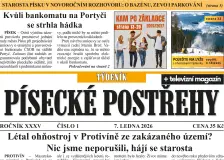 VIDEO: Hlídka budějovické městské policie byla první u hořící chaty v Husově kolonii15:42 ČESKÉ BUDĚJOVICE - Při běžné kontrolní činnosti narazila v úterý 6. ledna pohotovostní jednotka budějovické městské policie na nečekanou a nebezpečnou situaci. V zahradní kolonii si strážníci všimli hořící chaty a okamžitě zalarmovali hasiče. The post VIDEO: Hlídka budějovické městské policie byla první u hořící chaty v Husově kolonii appeared first on Jižní Čechy Teď! . Zelený led na Lipně: Sinice překvapily uprostřed zimy15:09 LIPNO - Neobvyklý přírodní jev se objevil na jihočeské nádrži Lipno na konci roku 2025. Velké množství nahromaděných sinic ve vodě způsobilo zelené zbarvení ledu. Úkaz podrobně zdokumentovali hydrobiologové z Biologického centra Akademie věd ČR, kteří provedli i odběry a analýzy vzorků. Vzhledem k tomu, že existuje velmi málo vědeckých záznamů tohoto jevu, bude lipenský zelený led jedním z nejlép… Ve Větřní se začala objevovat divoká prasata. Pomohou pachové odpuzovače?14:05 VĚTŘNÍ - V okrajových lokalitách u silnic směrem na Český Krumlov, Rožmberk a Kájov, ale také v blízkosti rodinných domů ve Větřní se v minulých týdnech vyskytovala divoká prasata. Situace se zlepšila během vánočních svátků, město ale i tak uvažuje co dělat, pokud by se prasata vrátila. Jednou z možností je instalace pachových odpuzovačů. The post Ve Větřní se začala objevovat divoká prasata. Pom… Policisté hledají svědky nehody, která se stala na Budějovicku13:00 ČESKÉ BUDĚJOVICE - Neznámý řidič způsobil 7. prosince dopravní nehodu na Budějovicku, v obci Vrcov u domu s číslem popisným 79. Při couvání narazil do auta značky Škoda Superb, které stálo zaparkované před domem a následně z místa ujel, aniž by událost oznámil. The post Policisté hledají svědky nehody, která se stala na Budějovicku appeared first on Jižní Čechy Teď! . Lyžařské podmínky v areálech jsou výborné. Vyhrajte skipasy na Lipno, Monínec a Špičák12:27 SOUTĚŽ O SKIPASY. Lyžařská sezóna je v plném proudu a Jihočeské týdeníky vás budou každý týden provázet tím nejlepším, co nabízejí sjezdovky v regionu i jeho okolí. Přinášíme aktuální informace z Lipna, Monínce a Špičáku, tipy na akce i podmínky na svazích. Navíc můžete soutěžit o skipasy a vyrazit na svah úplně zdarma. The post Lyžařské podmínky v areálech jsou výborné. Vyhrajte skipasy na Lipno… Noc důstojnosti: Na Žižkově náměstí v Táboře uctili památku Doroty Šandorové12:27 TÁBOR - Pietní akce Noc důstojnosti za práva lidí s intelektovým postižením proběhla na Žižkově náměstí v Táboře v úterý 6. ledna od 17 hodin. Účastníci setkání, které poprvé hostil veřejný prostor, podpořili rozvoj komunitních služeb a uctili památku Doroty Šandorové, kterou zabil její ošetřovatel. The post Noc důstojnosti: Na Žižkově náměstí v Táboře uctili památku Doroty Šandorové appeared fir… Mladík z Písku pomohl ženě v nouzi. Poděkoval mu za to starosta11:24 PÍSEK - Dobré srdce a ochota pomoci člověku v nouzi nechybí mladému Písečanovi Josefu Vlčkovi, žákovi zdejšího středního odborného učiliště. Loni v prosinci přivolal pomoc osamělé ženě, která kvůli zdravotní indispozici zůstala uvězněna ve svém bytě. The post Mladík z Písku pomohl ženě v nouzi. Poděkoval mu za to starosta appeared first on Jižní Čechy Teď! . Dnes na hokej! Králové vyzvou Kadaň10:51 PÍSEK – V prvním utkání nového roku písečtí hokejisté splnili povinnost a z ledu posledního Ústí nad Labem přivezli jednoznačnou výhru. Dnes ve středu 7. ledna je čeká další soupeř z chvostu tabulky, se kterým by měli vyhrát. V rámci 26. kola 2. ligy k Otavě přijede Kadaň. Předposlední tým má na kontě o jedenáct bodů méně než žlutomodří. Zvládne celek trenéra Jana Šuráně roli favorita i tentokrát… Řidička v Táboře srazila autem psa. Majitelku zvířete čeká správní řízení10:18 TÁBOR - K nehodě, při které srazilo auto volně pobíhajícího psa došlo v pondělí 5. ledna krátce po 19. hodině v Pelhřimovské ulici v Táboře. Když řidička vystoupila zjistila, že kolem pobíhá ještě jeden pes, kterého se jí podařilo odchytit. Majitelka zvířat teď bude muset vysvětlovat, proč byla zvířata na ulici bez dozoru. The post Řidička v Táboře srazila autem psa. Majitelku zvířete čeká správn… Jak omezit komunální odpad? Nová Včelnice mění zažitá pravidla třídění i svozu9:44 NOVÁ VČELNICE – Poté, co ve středu 7. ledna svozová firma vyprázdní tradiční černé popelnice, budou si muset obyvatelé Nové Včelnice na další svoz počkat nikoli týden, jak je stále zvykem ve většině měst a obcí, nýbrž čtrnáct dní. „Myslím, že je to správný krok, jak snížit objem komunálního odpadu,“ říká starosta Tomáš Hrubec. Tato změna ale není jedinou novinkou systému, který město pro nakládán… Bezdomovec kradl na Strakonicku. Mimo jiné i ve smuteční síni8:38 STRAKONICKO - Krádeže i vloupání na Strakonicku má na svědomí recidivista bez domova. Policisté zloděje zadrželi poté, co odcizil peníze z pokladničky určené k úhradě zboží ve volně přístupném samoobslužném krámku v malé obci u Čejetic. Následně se přiznal i k dalším činům. The post Bezdomovec kradl na Strakonicku. Mimo jiné i ve smuteční síni appeared first on Jižní Čechy Teď! . Historický kříž u Vondrova na Českobudějovicku prošel rekonstrukcí8:04 ČESKOBUDĚJOVICKO - Bezmála dvoumetrový kříž na kamenném podstavci postavený v 70. letech 19. století Janem Adolfem Schwarzenbergem obnovily u někdejšího panského dvora Vondrov v katastru Hluboké nad Vltavou za bezm