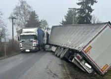 /VIDEO, FOTOGALERIE/ Smůlu měl v úterý dopoledne mladý řidič kamionu Renault, který havaroval zhruba kilometr před cílem své relativně dlouhé cesty. Podle jeho slov se na úzké silnici vyhýbal protijedoucímu kamionu, když se s ním utrhla krajnice. Před úplným převrácením ho zachránil spodní boční regál s nářadím, který se zapřel o zem.